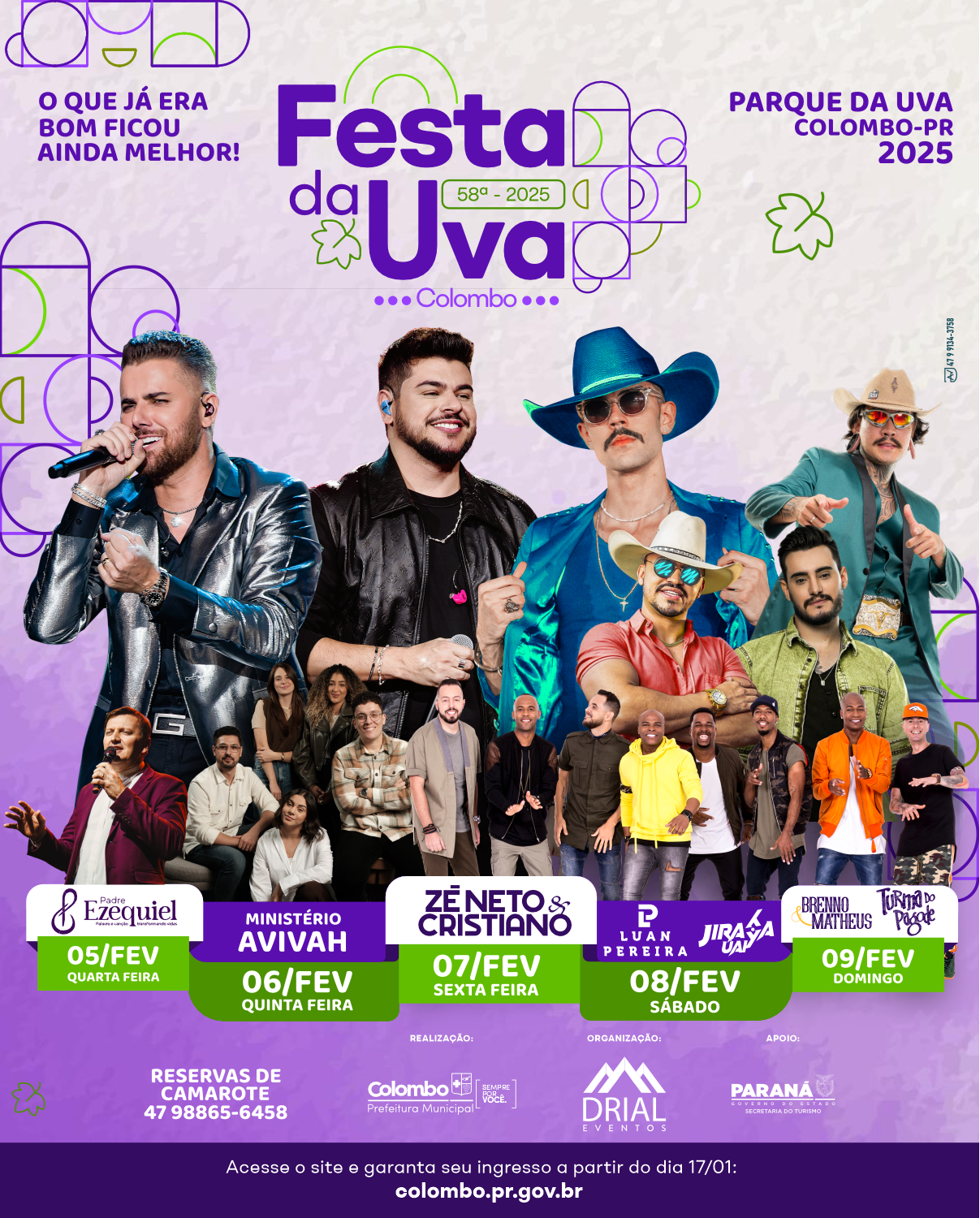 A 58ª Festa da Uva de Colombo está chegando e promete ser uma celebração inesquecível! Com uma programação repleta de atrações incríveis, de 05 a 09 de fevereiro de 2025, a festa será um evento ainda mais inclusivo, sustentável e seguro, pensado para todos aproveitarem com conforto e responsabilidade.