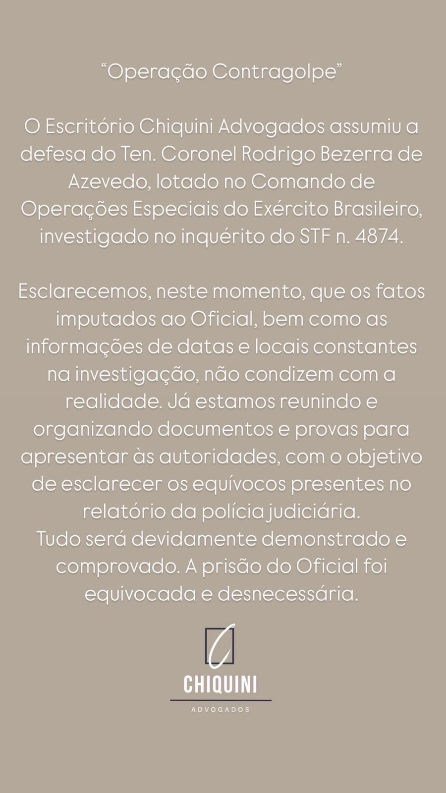 O advogado criminalista Jeffrey Chiquini, com atuação em Curitiba, assumiu a defesa do tenente-coronel Rodrigo Bezerra de Azevedo, preso pela Polícia Federal (PF) na operação Contragolpe. Azevedo é apontado como um dos articuladores de um suposto plano golpista que visava a morte do presidente Luiz Inácio Lula da Silva, do vice-presidente Geraldo Alckmin e do ministro do Supremo Tribunal Federal (STF), Alexandre de Moraes.