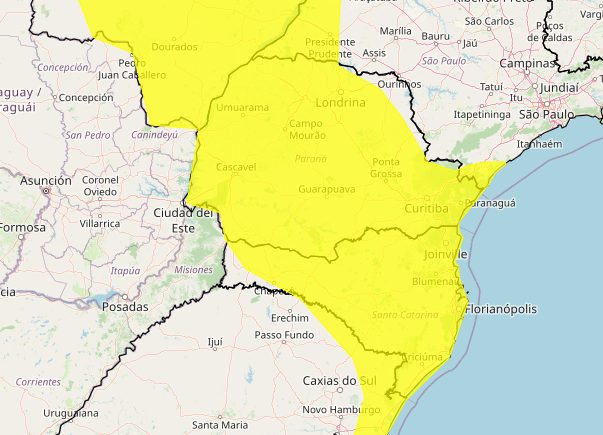 Além de Curitiba e região metropolitana, o alerta também inclui diversas regiões do Paraná, como Norte Pioneiro, Centro Ocidental, Noroeste, Norte Central, Sudeste, Sudoeste, Oeste e Centro-Sul do estado.