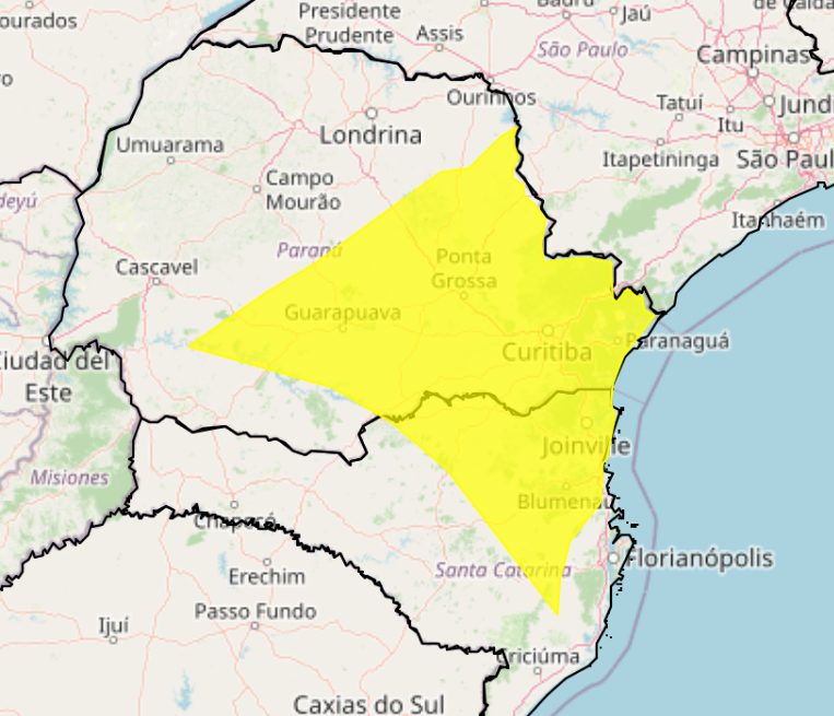 O Instituto Nacional de Meteorologia (INMET) emitiu um alerta de tempestade para Curitiba e região metropolitana, válido nesta quinta-feira (19), com grau de severidade classificado como Perigo Potencial. O aviso está em vigor desde as 10h05min e segue até às 16h00min de hoje.