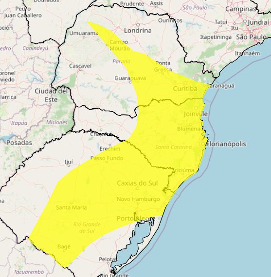 O alerta abrange áreas significativas nos estados do Paraná, Santa Catarina e Rio Grande do Sul, incluindo as regiões: