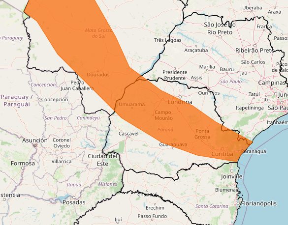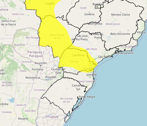 Com menor intensidade, este aviso prevê chuvas de 20 a 30 mm/h ou até 50 mm/dia, acompanhadas de ventos de 40 a 60 km/h. Apesar de o risco ser considerado baixo, a população deve estar atenta. Este alerta também abrange a região metropolitana de Curitiba e outras áreas do Paraná.