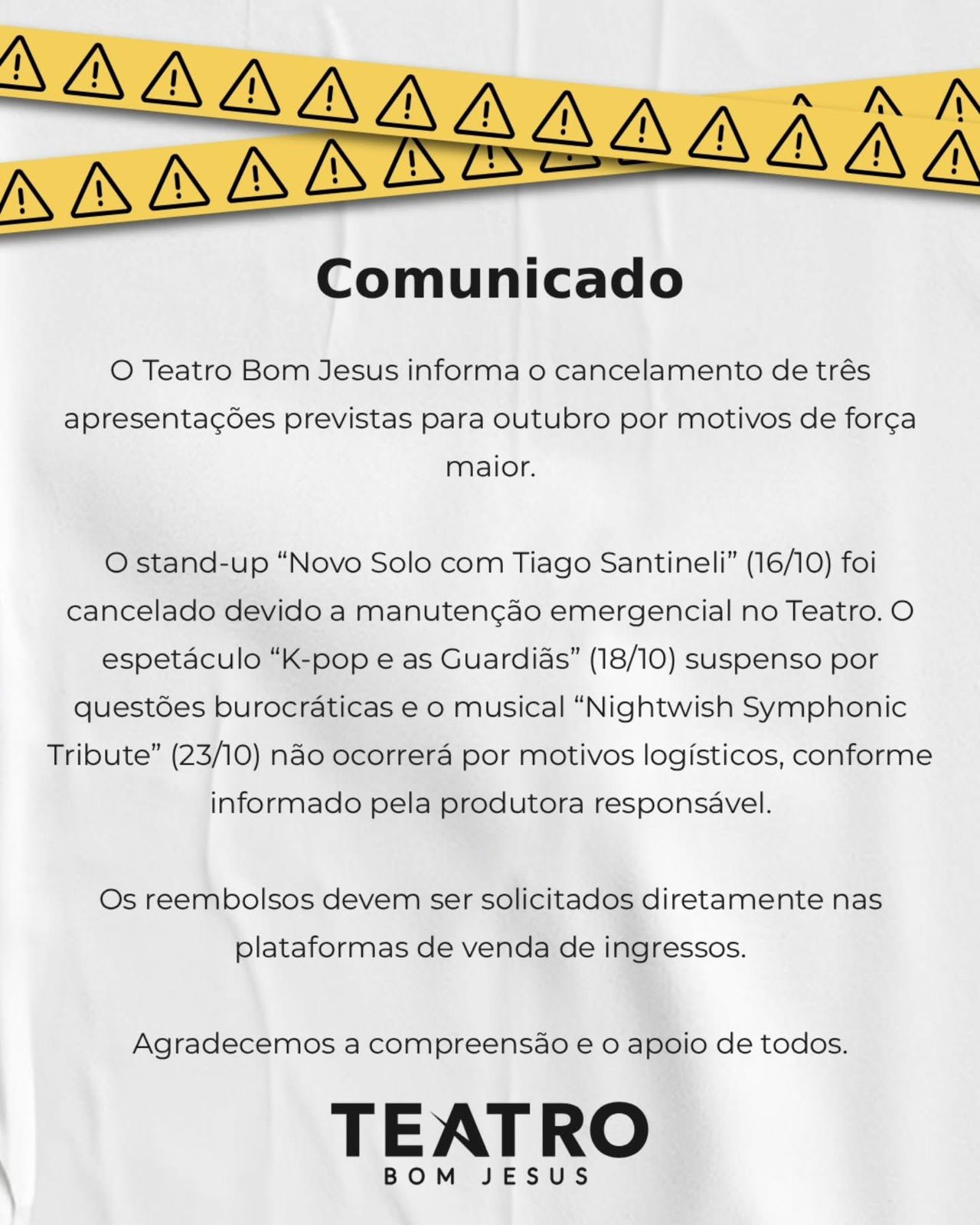 O stand-up “Novo Solo com Tiago Santineli”, que seria apresentado na última quinta-feira (16) no Teatro Bom Jesus, em Curitiba, foi cancelado. O próprio teatro divulgou um comunicado informando que a apresentação não ocorreu por conta de uma manutenção emergencial, classificada como motivo de força maior.