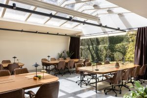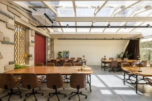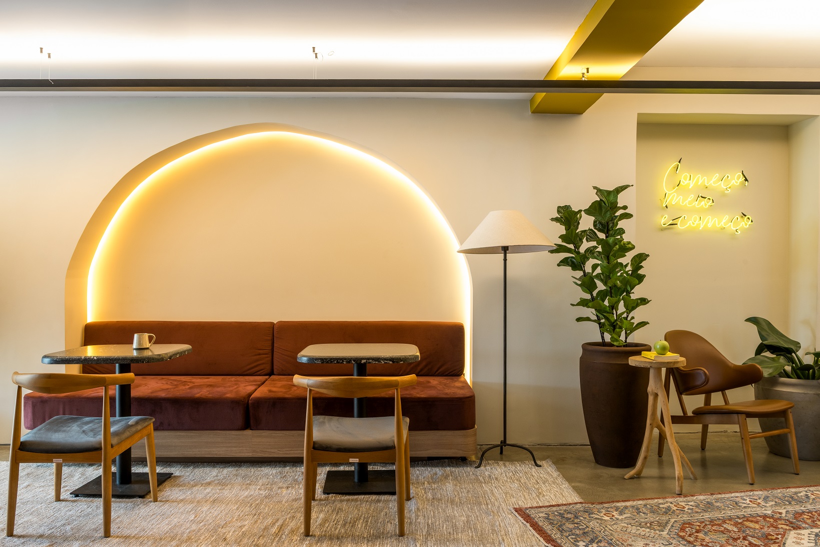 A ideia central foi criar um ambiente que estimula encontros de pessoas, ideias e propósitos, em um espaço que combina o conforto de uma casa com a energia de um clube de convivência. Os materiais e acabamentos reforçam essa atmosfera: pedras naturais com veios marcantes, tecidos aveludados, cores quentes e texturas convidativas. A mistura entre peças vintage e elementos contemporâneos cria um cenário familiar e, ao mesmo tempo, atual. Assinado pelo estúdio curitibano Ete Oficina, o projeto arquitetônico traz na concepção dos ambientes uma multiplicidade: áreas moduláveis, design biofílico, inserção de arte e mobiliário que se adapta a diferentes usos; de reuniões estratégicas a eventos culturais ou instantes de contemplação individual. O layout foi pensado para favorecer conversas e permanência.