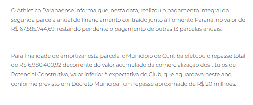 Em nota, o Athletico explicou que os pagamentos seguem um formato de parcelas decrescentes, com base na Taxa de Juros de Longo Prazo (TJLP), acrescida de 1,9% ao ano. Por conta dos juros, o valor total a ser quitado chega a R$ 414 milhões. Deste montante, a Prefeitura de Curitiba ainda tem um compromisso de aproximadamente R$ 50 milhões, com vencimento previsto para julho, além dos R$ 233 milhões relacionados ao potencial construtivo.