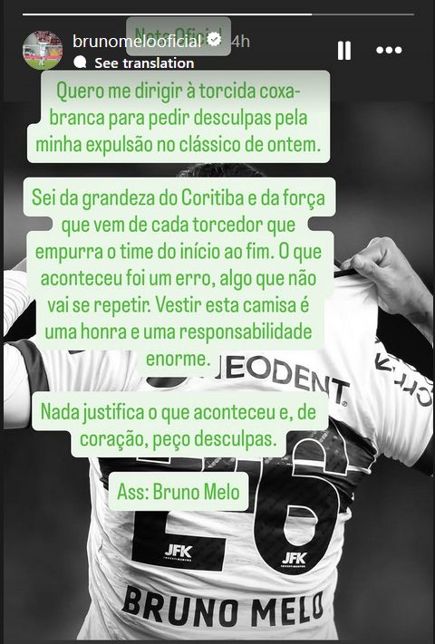 O lateral-esquerdo Bruno Melo, de 32 anos, usou as redes sociais para pedir desculpas à torcida do Coritiba após ser expulso ainda no primeiro tempo do clássico contra o Athletico Paranaense, realizado no domingo (19). A expulsão ocorreu aos 26 minutos, depois que o jogador recebeu o segundo cartão amarelo por retardar uma cobrança de lateral do adversário.