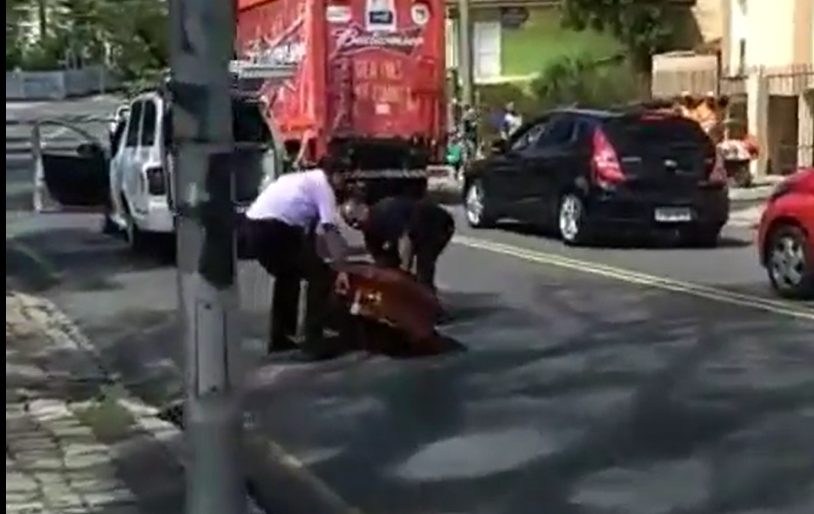 O momento foi registrado por um pedestre que passava pelo local e filmou a movimentação. Nas imagens, é possível ver o caixão caído no meio da rua, enquanto dois funcionários do veículo funerário correm para recolocá-lo no porta-malas, que estava aberto no momento da ocorrência.