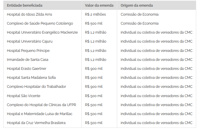 Câmara de Curitiba anuncia R$ 12 mi em emendas para hospitais do SUS