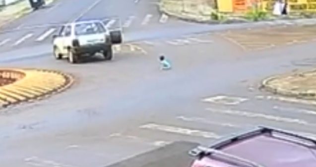 Na tarde desta quarta-feira (19), uma cena preocupante foi registrada por câmeras de segurança na Avenida Tupi, em Pato Branco, no sudoeste do Paraná. Uma criança caiu de um carro em movimento enquanto o veículo fazia uma rotatória.