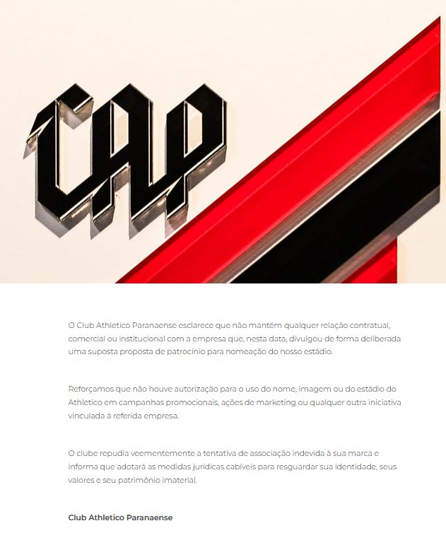 Em resposta à movimentação, o clube publicou uma nota oficial na noite de sexta-feira (6) rechaçando qualquer vínculo com a empresa. O Athletico declarou que tomará “medidas jurídicas cabíveis para resguardar sua identidade, seus valores e seu patrimônio imaterial”.