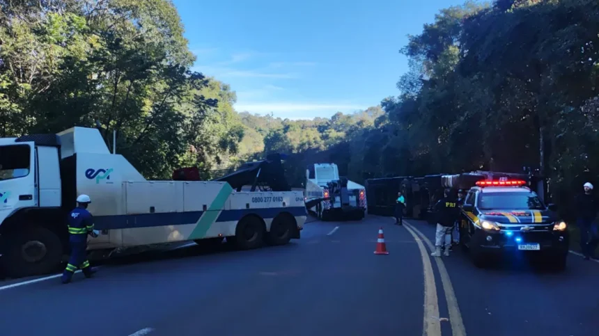 Na manhã deste sábado (6), um caminhão que transportava pneus tombou na BR-277, em Nova Laranjeiras, na região central do Paraná. O acidente aconteceu por volta das 9h30, na altura do km 484. Apesar do susto, o motorista do veículo não sofreu ferimentos.