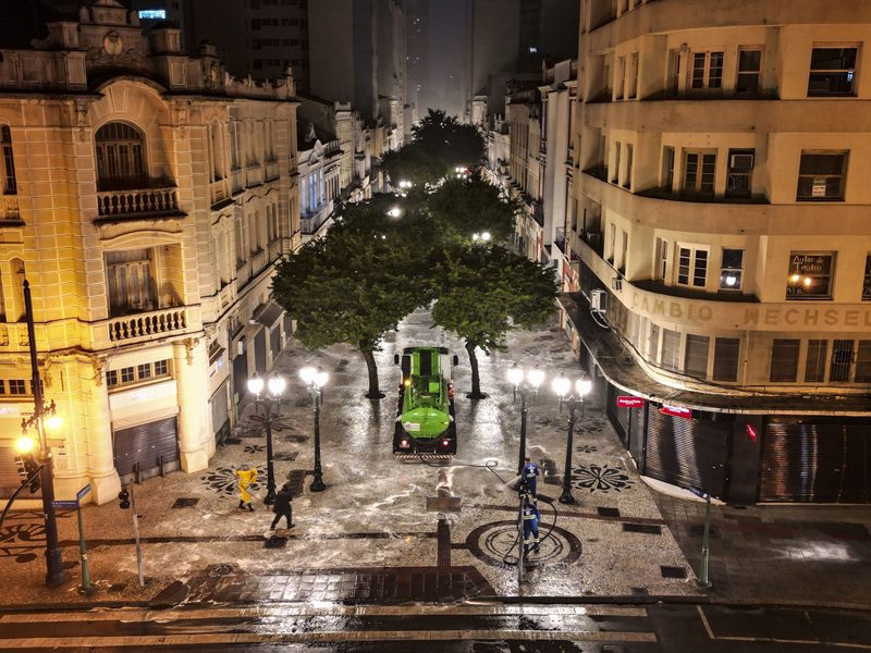 Uma vez por mês, durante a madrugada, o Calçadão da Rua XV de Novembro passa por uma lavagem completa, feita com água de reúso e sabão neutro.