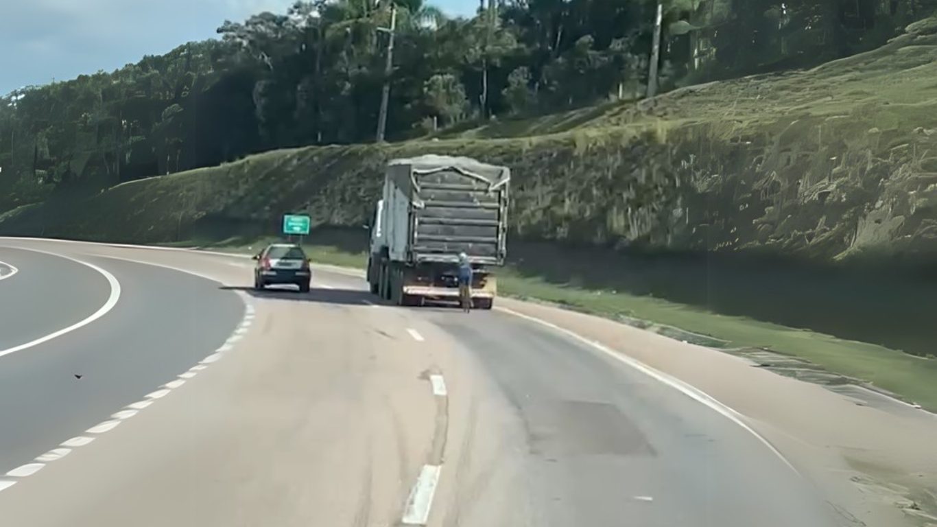 Um vídeo que circula nas redes sociais nesta semana mostra um flagrante preocupante registrado na BR-116, na região do bairro Tatuquara, em Curitiba. As imagens, feitas na última sexta-feira (9), mostram um ciclista adulto se arriscando ao se prender na traseira de um caminhão em movimento, no sentido Fazenda Rio Grande.