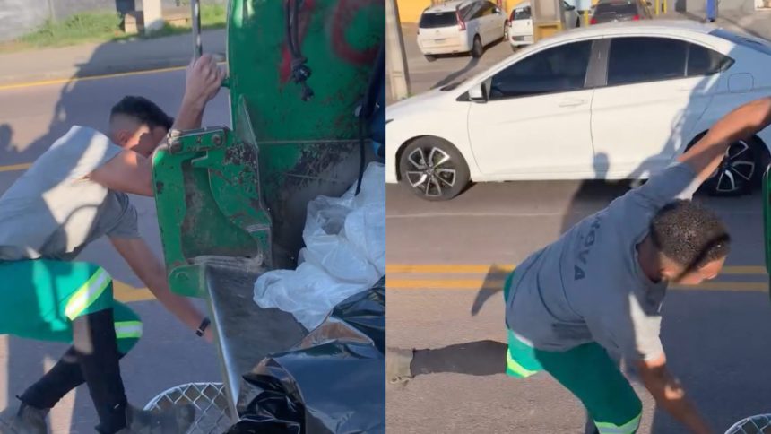 As imagens, publicadas nas redes sociais, mostram Denilson pendurado na barra traseira do caminhão de coleta, utilizada pelos trabalhadores para se apoiar durante os trajetos. Em determinado momento, ele encosta a mão e o pé no chão enquanto o veículo segue em movimento, prática que gerou repercussão e críticas por conta do risco envolvido.