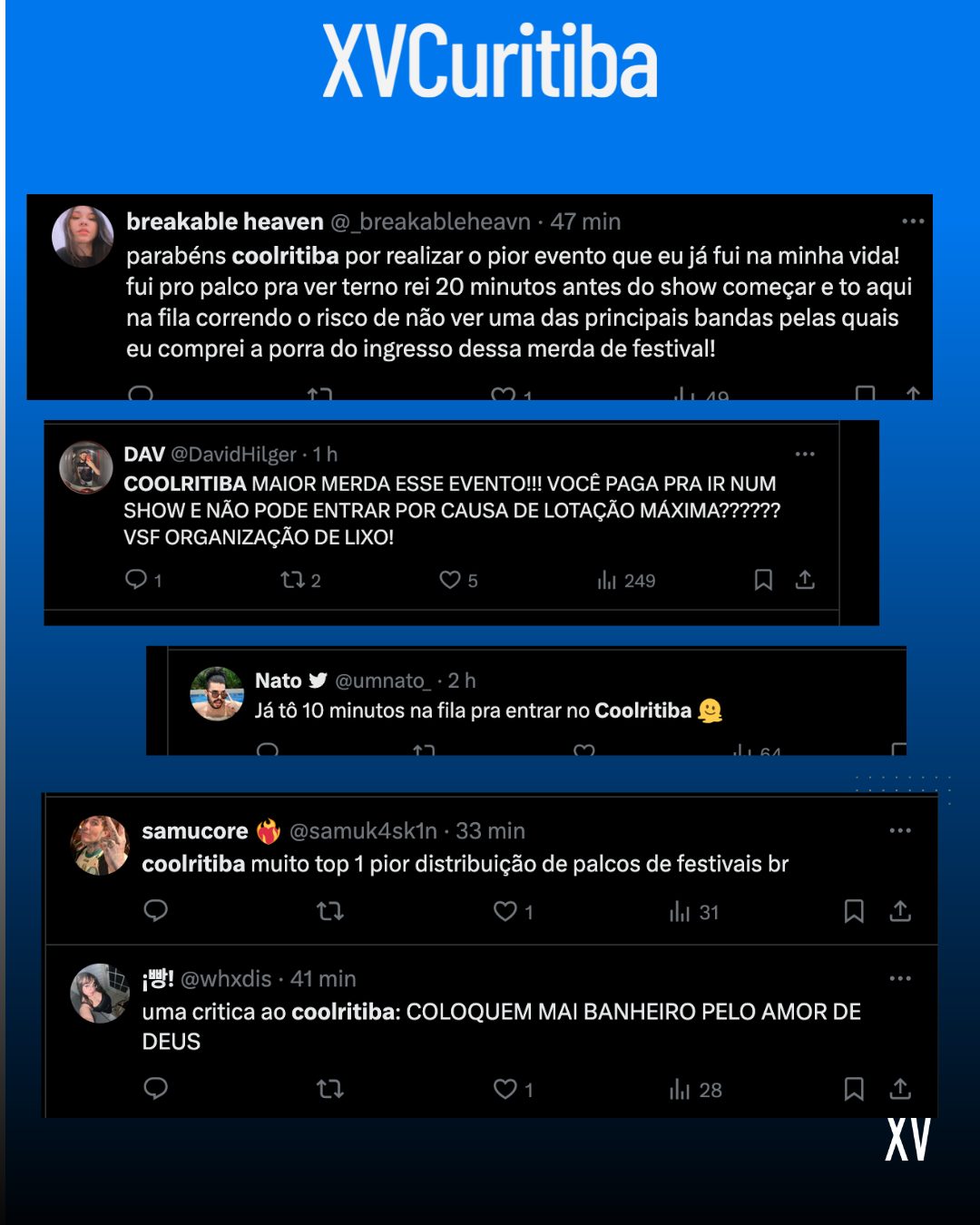 Além das filas, a estrutura do festival também foi criticada. Participantes reclamaram da má distribuição dos palcos e da falta de banheiros. “Coolritiba muito top 1 pior distribuição de palcos de festivais BR”, ironizou um perfil. “Coloquem mais banheiros pelo amor de Deus”, escreveu outro usuário.