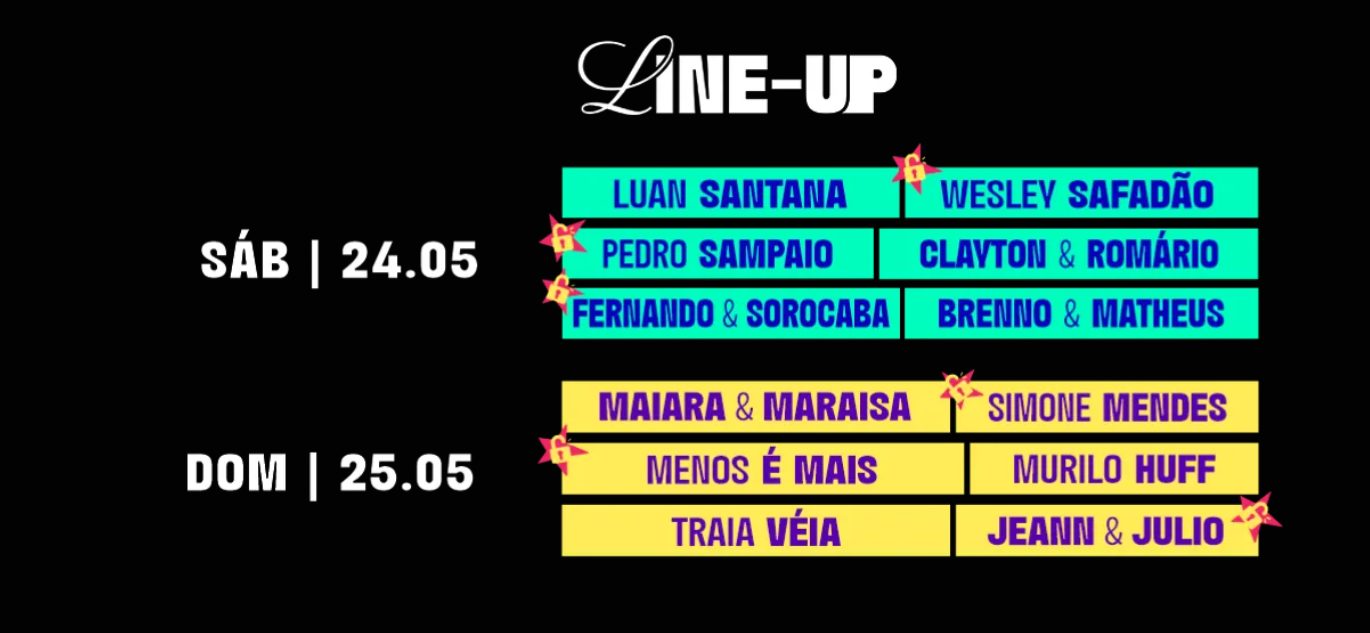 O primeiro dia do evento, sábado (24/05), contará com apresentações de Luan Santana, Wesley Safadão, Pedro Sampaio, Clayton & Romário, Fernando & Sorocaba e Brenno & Matheus. Já no domingo (25/05), o público será embalado pelos shows de Maiara & Maraisa, Simone Mendes, Menos É Mais, Murilo Huff, Traia Véia e Jeann & Julio.