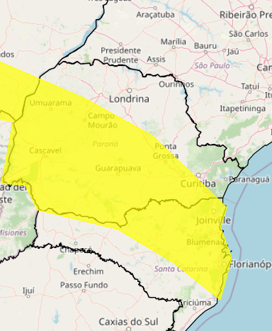 O alerta inclui áreas como a Região Metropolitana de Curitiba, Centro-Sul, Oeste, Noroeste, Sudoeste, Sudeste e Centro Ocidental Paranaense, além de regiões próximas em Santa Catarina e no Mato Grosso do Sul.