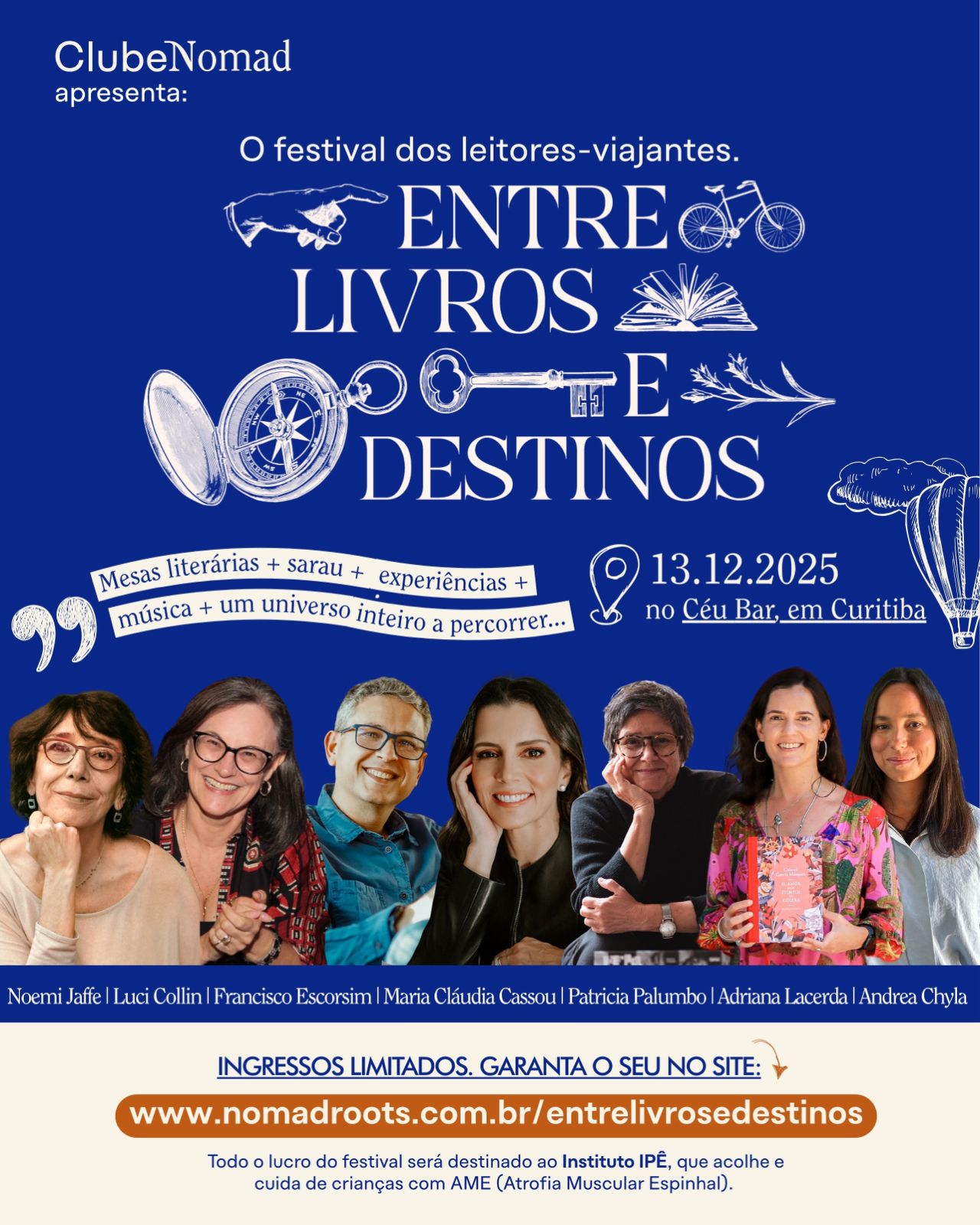 O Festival Entre Livros & Destinos acontece no próximo dia 13 de dezembro, em Curitiba, das 10h às 14h, no Céu Bar (Rua Desembargador Costa Carvalho, 471). A entrada é R$50 (inteira) e R$25 (meia-entrada) e os ingressos podem ser adquiridos pelo site www.nomadroots.com.br/entrelivrosedestinos. Todo o lucro do festival será destinado ao Instituto IPÊ, que acolhe e cuida de crianças com AME (atrofia muscular espinhal). Para mais informações siga os perfis no Instagram @clube.nomad e @nomad.roots.