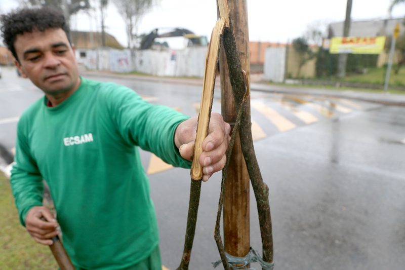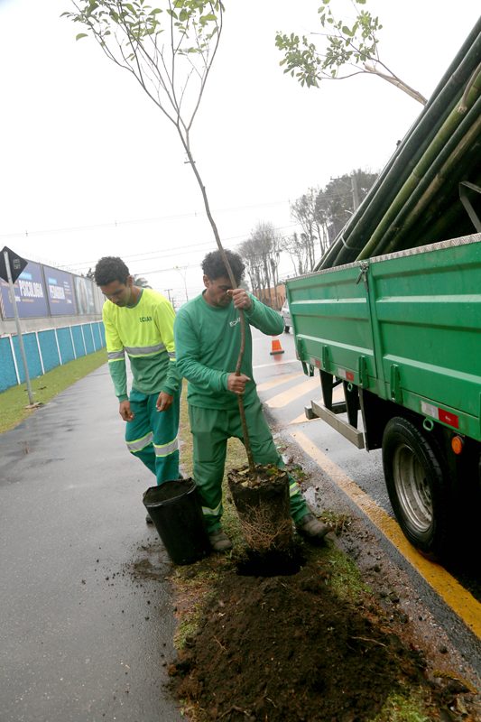 As equipes de manutenção da arborização viária do Departamento de Arborização e Produção Vegetal, da Secretaria Municipal do Meio Ambiente, enfrentaram a chuva da manhã desta sexta-feira (8/8) para fazer o replantio de árvores que foram vandalizadas na Rua Waldemar Loureiro Campos, entre as ruas Doutor Danilo Gomes e a Cristiano Strobel, no bairro Boqueirão.