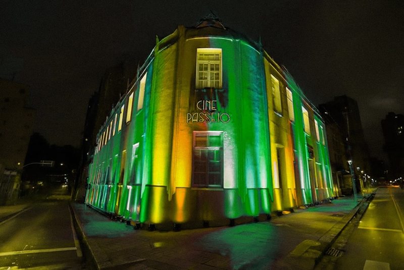 Iluminação verde-amarelo na fachada do Cine Passeio