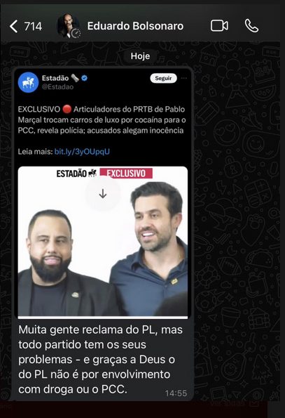 O deputado federal Eduardo Bolsonaro (PL) lançou uma crítica direta a Pablo Marçal na quarta-feira (21/8), ao compartilhar uma matéria polêmica com seus contatos no WhatsApp. A matéria, veiculada pelo jornal Estadão, alega que membros do PRTB, partido ao qual Marçal é filiado, teriam trocado carros de luxo por cocaína com integrantes do Primeiro Comando da Capital (PCC).