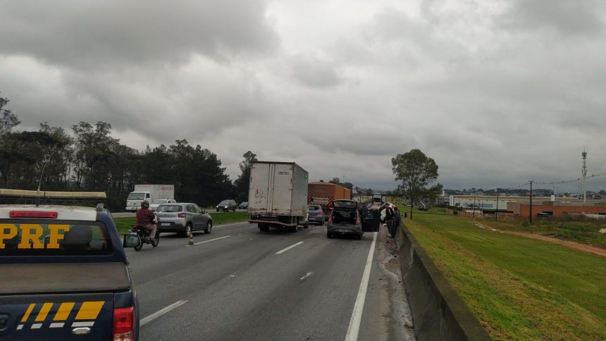 A concessionária Arteris Litoral Sul, responsável pela rodovia, informou que duas das três faixas no local foram interditadas para a retirada dos veículos envolvidos e o atendimento da ocorrência. O tráfego segue lento na região.