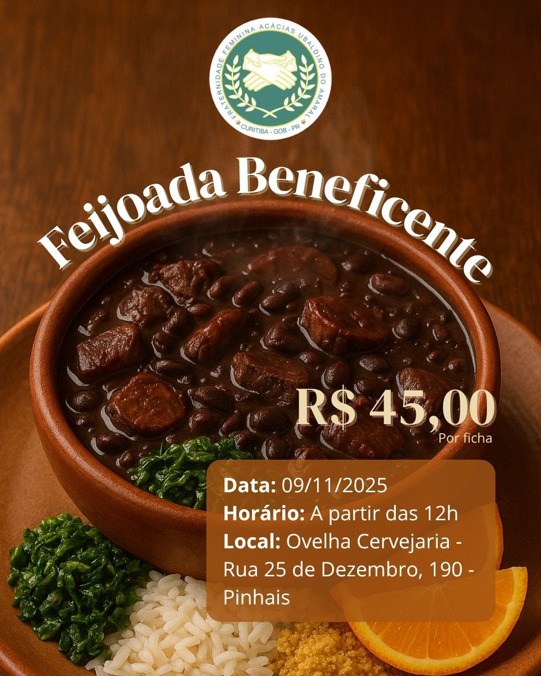 A Fraternidade Feminina Acácias Ubaldo do Amaral promove no dia 9 de novembro uma feijoada beneficente em Pinhais, na Região Metropolitana de Curitiba. O evento será realizado na Ovelha Cervejaria, localizada na Rua 25 de Dezembro, 190, a partir das 12h.