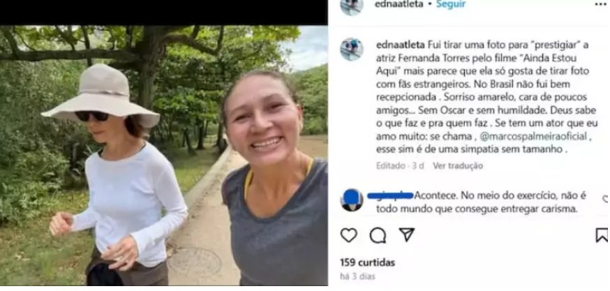 A atleta Edna Atleta, que encontrou a atriz no local, compartilhou em suas redes sociais uma foto ao lado de Fernanda Torres e demonstrou insatisfação com a interação. Na publicação, a mulher afirmou que não recebeu a atenção que esperava e fez críticas à postura da artista. “Fui tirar uma foto para ‘prestigiar’ a atriz Fernanda Torres pelo filme Ainda Estou Aqui, mas parece que ela só gosta de tirar foto com fãs estrangeiros”, escreveu.