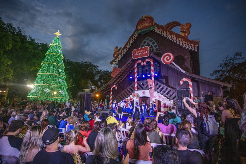 Em frente ao Oratório de Bach, transformado na Casa do Pão de Mel para o Natal de Curitiba 2025, a noite de domingo vai receber apresentações escolares, coral e danças folclóricas que precedem a atração principal.