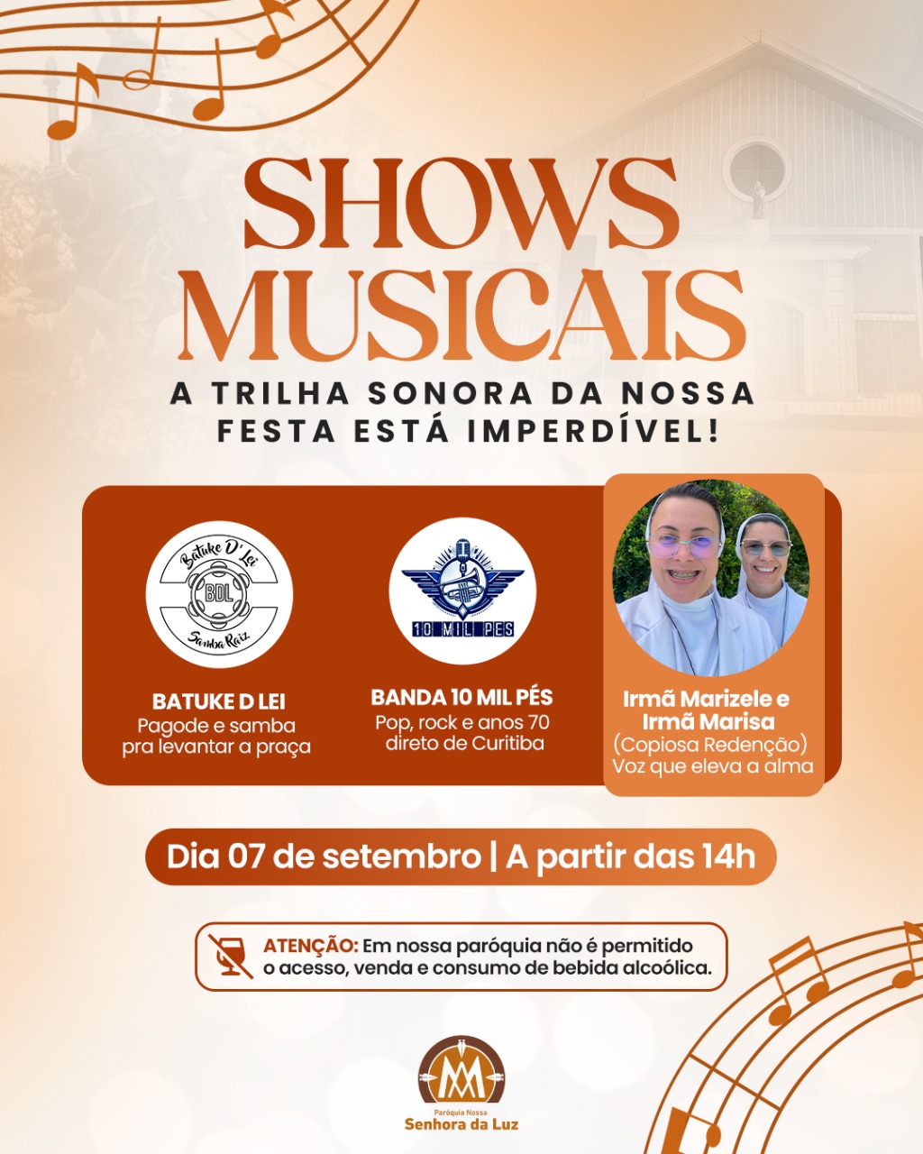 A Paróquia Nossa Senhora da Luz, no bairro CIC, em Curitiba, promove neste domingo (7) a tradicional festa em honra a Nossa Senhora da Luz dos Pinhais, padroeira da cidade. Entre as atrações, destaque para a participação das irmãs Marizele e Marisa, da Congregação da Copiosa Redenção. Conhecidas como as “Freitas do Beatbox”.