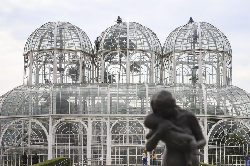 Os 18 metros de altura da cúpula da estufa do Jardim Botânico estão sendo vencidos com cordas e rapel. É a conclusão da limpeza das 3,8 mil peças de vidro de um dos principais cartões-postais de Curitiba.