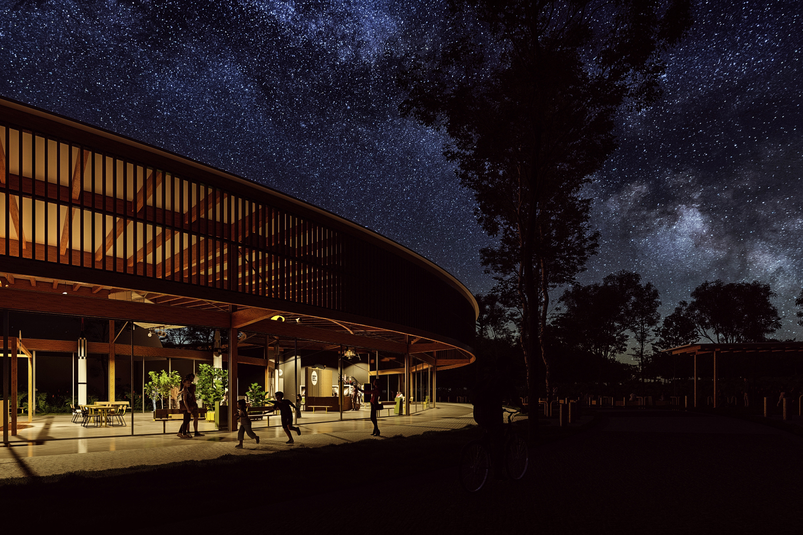 Com o tema Órbita, os arquitetos se inspiraram nos movimentos dos corpos celestes para o desenho do projeto. “Esse é o ponto fundamental, essa ideia de replicar os movimentos do universo e, ao mesmo tempo, utilizar sistemas construtivos do que se tem de mais moderno, mais sustentável e eficiente na construção civil, como a madeira engenheirada”, explica Faria.