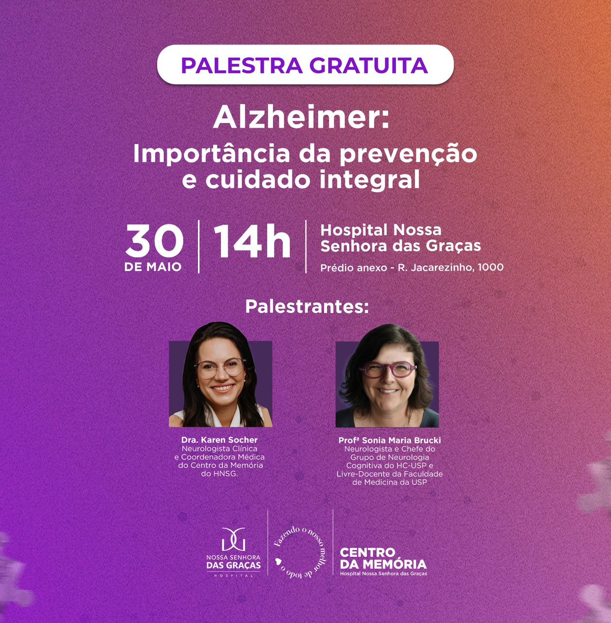 Será uma oportunidade para o público compreender melhor os primeiros sinais do Alzheimer, a importância da prevenção e os caminhos para um cuidado mais leve e assertivo. Também será apresentado sobre O Centro da Memória, novo serviço especializado do HNSG, que acaba de ser inaugurado.