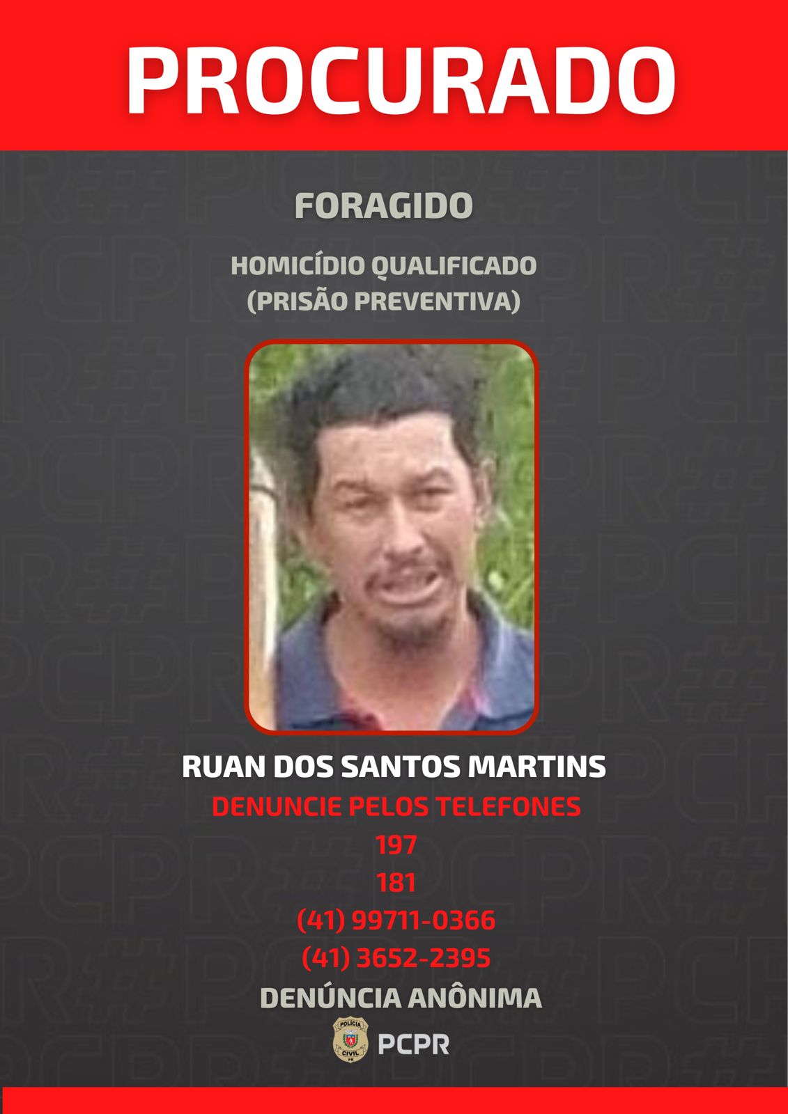 DENÚNCIAS – A PCPR solicita a colaboração da população com informações que levem ao paradeiro do foragido. Denúncias podem ser repassadas de forma anônima pelos números 197 da PCPR, 181 do Disque-Denúncia ou (41) 3652-2395 e (41) 99711-0366 diretamente à equipe de investigação.