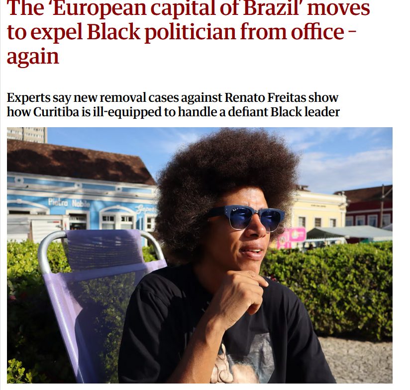 O jornal britânico The Guardian publicou nesta quarta-feira (13) uma reportagem sobre o deputado estadual Renato Freitas (PT) e as repetidas tentativas de cassação que ele enfrenta ao longo de sua trajetória política. A matéria, assinada pelo correspondente Tiago Rogero, aborda o processo em andamento na Assembleia Legislativa do Paraná (Alep), no qual o parlamentar é acusado de supostamente facilitar a entrada de professores e professoras no plenário durante a votação de um projeto que autorizava a terceirização da gestão de escolas estaduais.