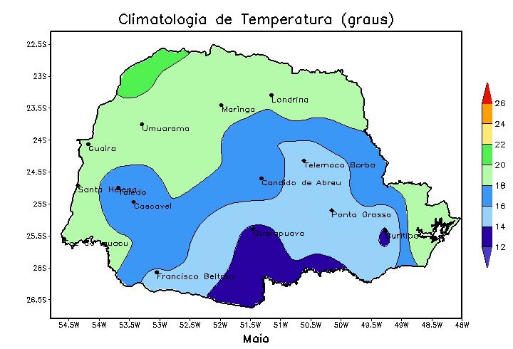Com relação a temperatura média, maio costuma ter temperaturas entre 12°C e 14°C no extremo Sul e na capital. A temperatura sobe gradativamente. Uma faixa da região Central até Francisco Beltrão tem temperatura média entre 14°C e 16°C em maio; a região de Cascavel, Toledo, Cândido de Abreu, seguindo por uma faixa até próximo ao Litoral paranaense que tem temperaturas entre 16°C e 18°C; cidades como Foz do Iguaçu, Santa Helena, Guaíra, Umuarama, Maringá, Londrina e o Litoral têm média de temperatura em maio entre 18°C e 20°C; e a temperatura média mais alta do mês fica no extremo Noroeste, entre 20°C e 22°C.