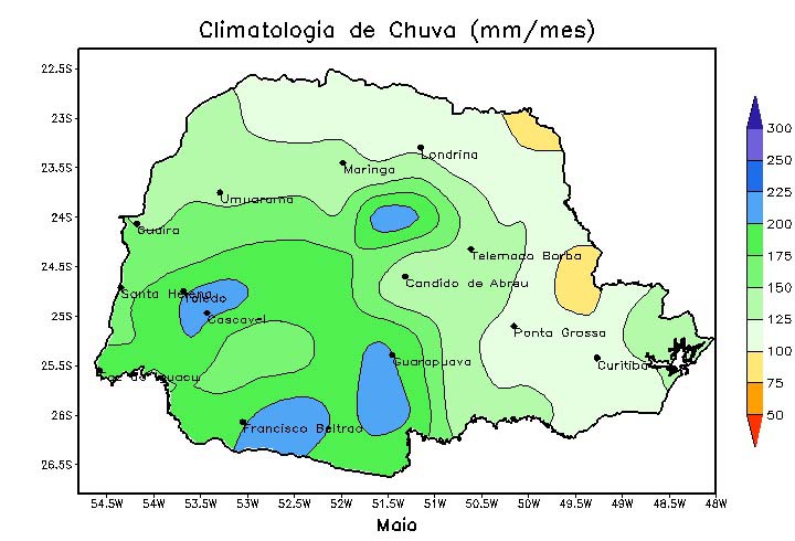 Historicamente a chuva é mais intensa no mês de maio nas regiões próximas as cidades de Cascavel, Toledo, Francisco Beltrão, Guarapuava e Ivaiporã, com acumulados de aproximadamente 200 mm de chuva. Os locais com menos chuva são as áreas que fazem limite com São Paulo e a Região Metropolitana de Curitiba, que costumam registrar acumulados entre 75 mm e 125 mm de chuva.
