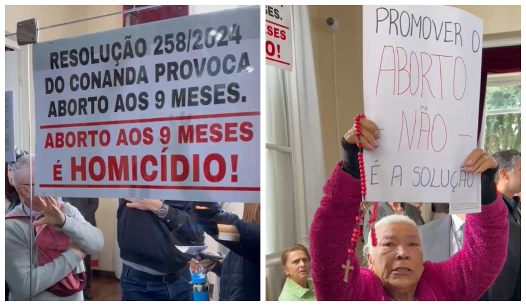 Grupos pró-vida se reuniram na manhã desta segunda-feira (7) em frente à Câmara Municipal de Curitiba para protestar contra a Resolução nº 258/2024, do Conselho Nacional dos Direitos da Criança e do Adolescente (Conanda). Os manifestantes exibiram cartazes com frases como “Manifestação pela vida, direito de nascer”, “Não ao aborto” e “Aborto aos 9 meses é homicídio”.