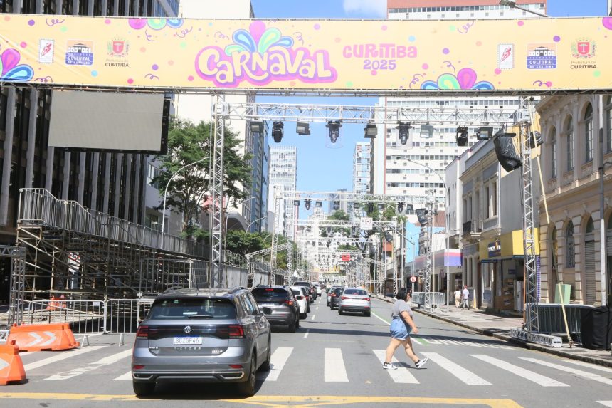 A Rua Marechal Deodoro, no Centro, está com bloqueios totais e parciais para a montagem da estrutura para os desfiles do Carnaval de Curitiba 2025, marcados para o próximo sábado (1/3) e domingo (2/3). Os bloqueios ocorrem em diferentes horários, no trecho entre as ruas Barão do Rio Branco e a Avenida Marechal Floriano Peixoto.
