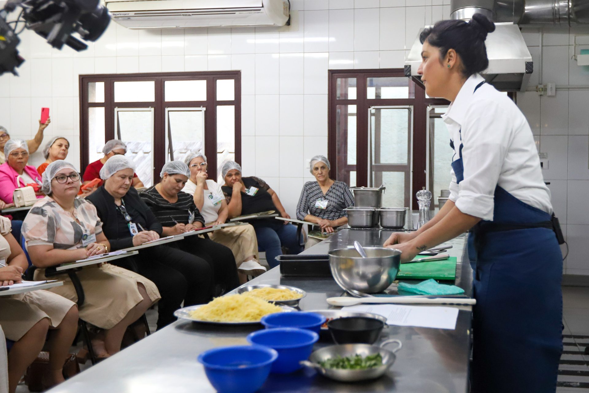 Manu nasceu em Maringá, tem pé vermelho e compartilhou suas vivências na cozinha. Ela também falou sobre sustentabilidade e deu dicas de receitas com produtos disponíveis nas escolas, a maioria deles da agricultura familiar. Ela fez omelete de macarrão, massa de brócolis com farinha sem ovos e macarrão de forno, tudo em primeira mão para as servidoras que estão todos os dias trabalhando na alimentação de milhares de crianças.