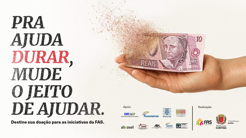Com o slogan “Pra a ajuda durar, mude o jeito de ajudar”, a campanha de solidariedade da Prefeitura de Curitiba e de instituições da sociedade civil pretende promover uma reflexão sobre a melhor forma de realizar doações que sejam realmente efetivas para solucionar problemas sociais.