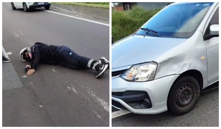 Na manhã desta terça-feira (8), um motociclista ficou ferido após colidir com um veículo Toyota Etios em uma via próxima à fábrica da Volvo, nas imediações de atacadistas, em Curitiba.
