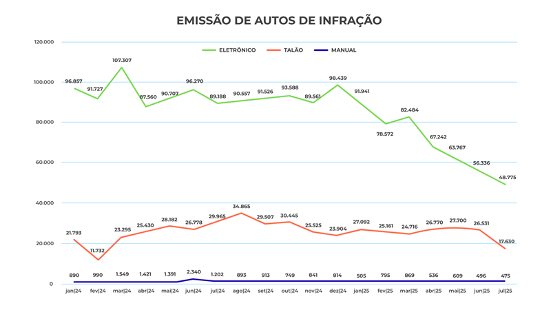 No período de janeiro a julho de 2025 houve o registro de 489.117 infrações, e no mesmo intervalo do ano passado, o número de notificações emitidas por radares foi de 659.616 em Curitiba.