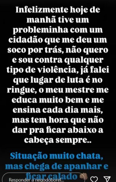 “Não quero e sou contra qualquer tipo de violência, já falei que lugar de luta é no ringue. Meu mestre me educa muito bem e me ensina cada dia mais, mas tem hora que não dá para ficar ‘abaixo a cabeça’ sempre”, declarou o cantor, referindo-se ao treino que realiza nas artes marciais. Apesar do tom defensivo, ele classificou a situação como “muito chata”, mas insistiu que “chega de apanhar e ficar calado”.