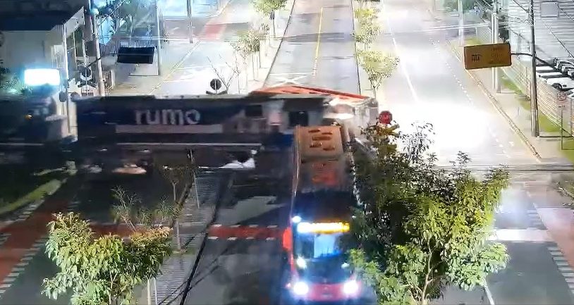Novas imagens divulgadas pela Urbanização de Curitiba (URBS) revelam o momento em que um ônibus biarticulado da linha Ligeirão Norte/Sul é atingido por um trem e parte ao meio, na noite de terça-feira (22), no bairro Cabral, em Curitiba. O acidente aconteceu no cruzamento da Avenida Paraná com a linha férrea, e chocou a cidade pela violência do impacto.