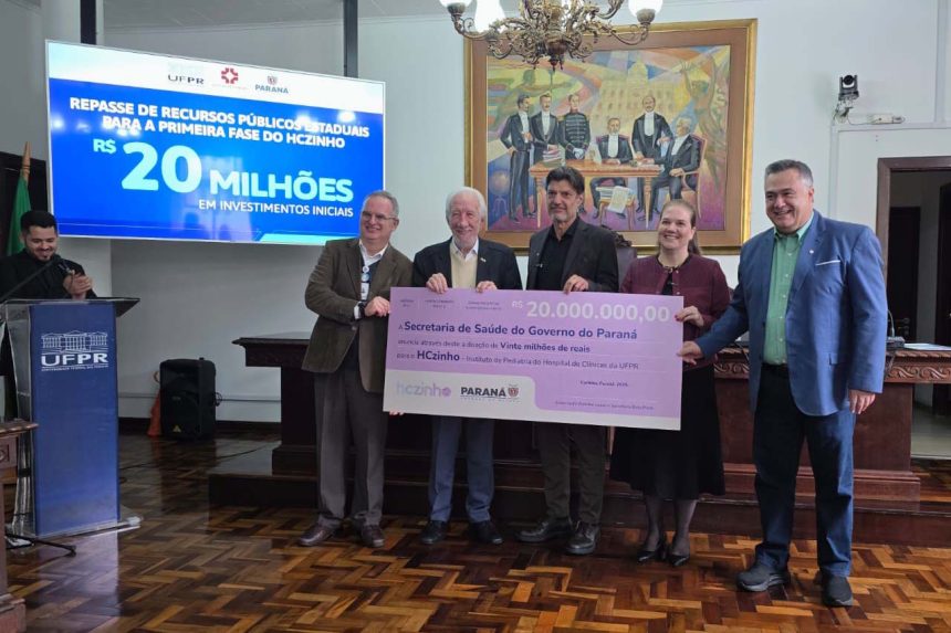 O Governo do Paraná, por meio da Secretaria da Saúde (Sesa), oficializou nesta segunda-feira (1º) a entrega de R$ 20 milhões em recursos para a primeira fase da construção do Instituto Pediátrico do Hospital de Clínicas, batizado de HCzinho. A solenidade, com a presença do vice-governador Darci Piana e do secretário da Saúde Beto Preto, ocorreu na Sala dos Conselhos Universitários da Reitoria da Universidade Federal do Paraná (UFPR), a quem o futuro hospital está vinculado.