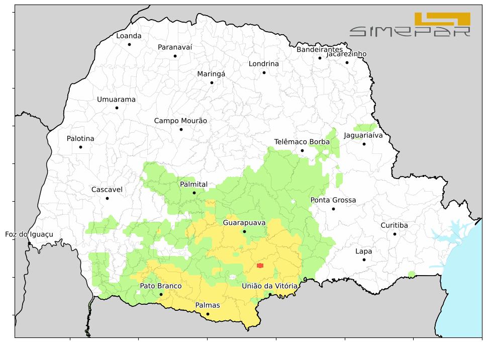 Para segunda-feira (11), a previsão aponta que a semana seguirá com frio no Paraná. O céu limpo, entre a madrugada e a manhã, deve favorecer a perda radiativa de calor da superfície para a atmosfera, provocando novo declínio das temperaturas próximas ao solo e condições para a formação de geadas. Os setores mais ao sul e os Campos Gerais terão os indicativos mais elevados, com risco de geadas moderadas no extremo sul do Estado — áreas em verde indicam geada fraca e em amarelo, geada moderada.