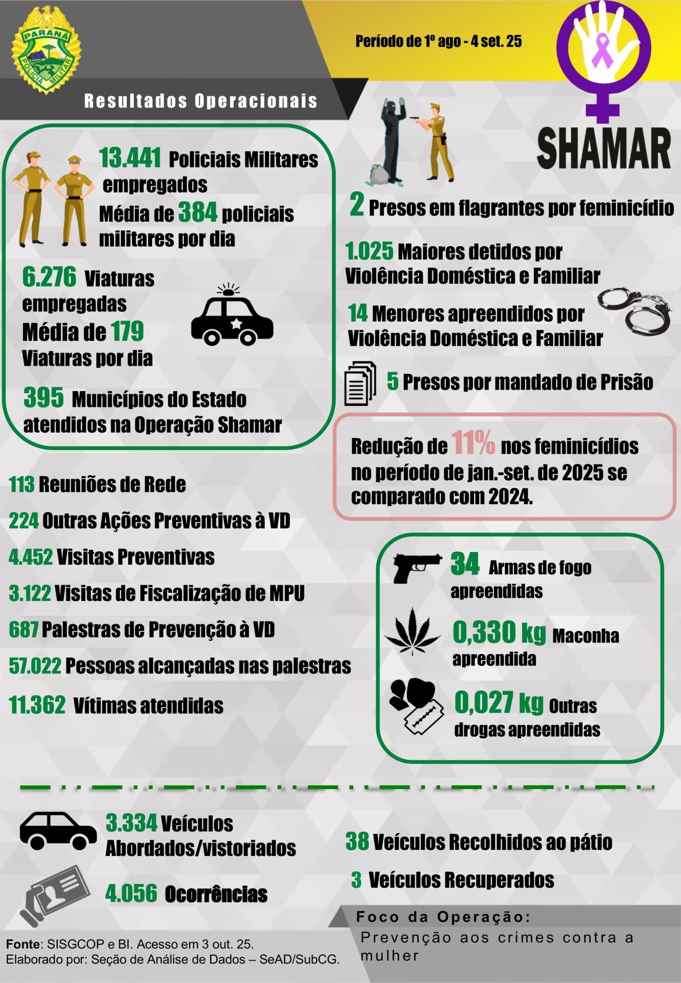 Os dados fazem parte do balanço da Operação Shamar, conduzida pela Polícia Militar do Paraná (PMPR), que teve como foco a prevenção e o enfrentamento aos crimes contra a mulher. A operação foi realizada entre 1º de agosto e 4 de setembro de 2025, com o envolvimento de 13.441 policiais militares e a utilização de 6.276 viaturas, alcançando 395 municípios do estado.