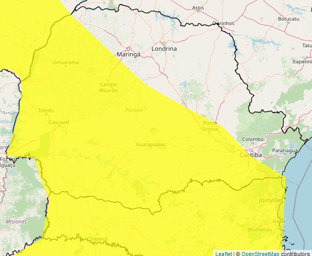 O Instituto Nacional de Meteorologia (Inmet) emitiu um alerta amarelo para chuvas intensas em grande parte do Paraná, válido até as 10h desta terça-feira (19). A previsão aponta para temporais com acumulado de chuva entre 20 e 30 milímetros por hora e rajadas de vento que podem variar entre 40 km/h e 60 km/h. O fenômeno apresenta riscos potenciais, como quedas de energia elétrica, alagamentos, queda de galhos de árvores e descargas elétricas.