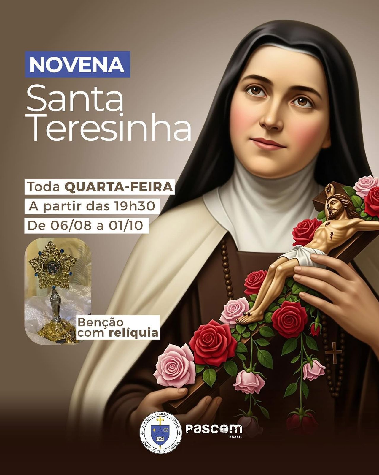 A Paróquia Sagrada Família, localizada na Cidade Industrial de Curitiba (CIC), inicia nesta quarta-feira (6) a Novena Milagrosa das Rosas de Santa Terezinha. A devoção segue por nove quartas-feiras, encerrando no dia 1º de outubro, data litúrgica da padroeira das missões.